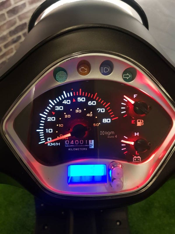 Hierbij een zeer nette AGM VX50 euro4 snorscooter vespa look 2019 met maar 4000km. Alles werkt naar behoren. Minimale gebruikers sporen. Scooter is zeer zuinig en is voorzien van vele options zoals, LED verlichting, USB aansluiting, hoge smoke windscherm, luxe zadel en 3 dubbele sleutels.